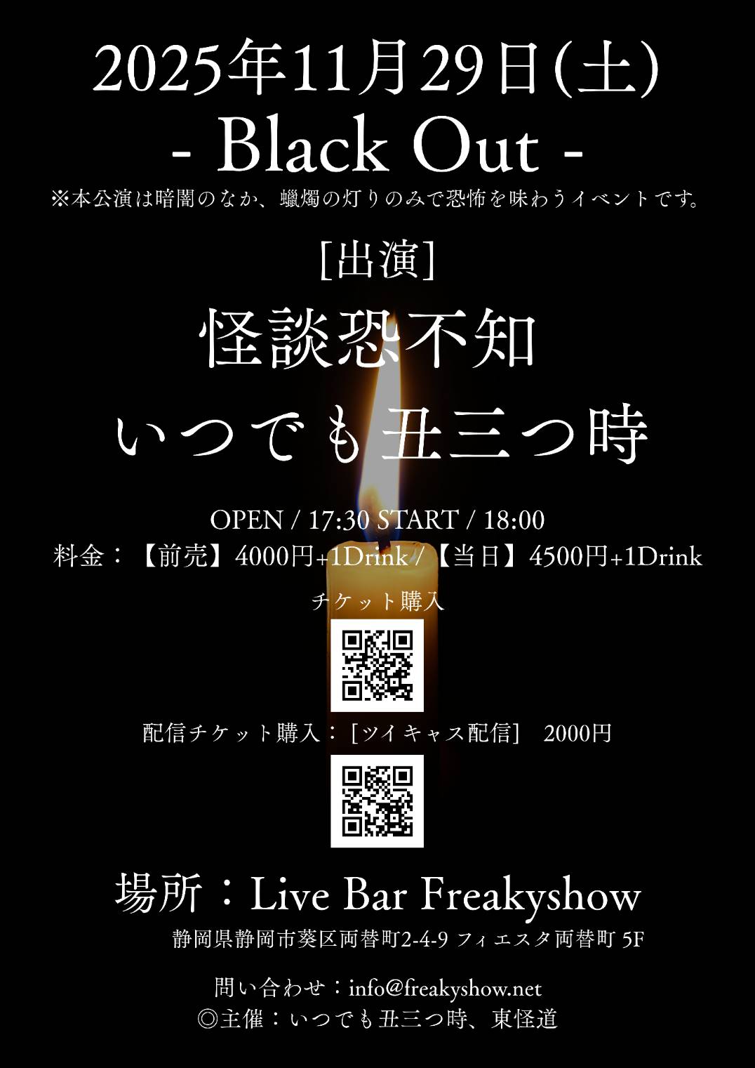 | 2025年11月29日(土) [夜の部] - Black Out - 出演:怪談恐不知、いつでも丑三つ時 //// | ||