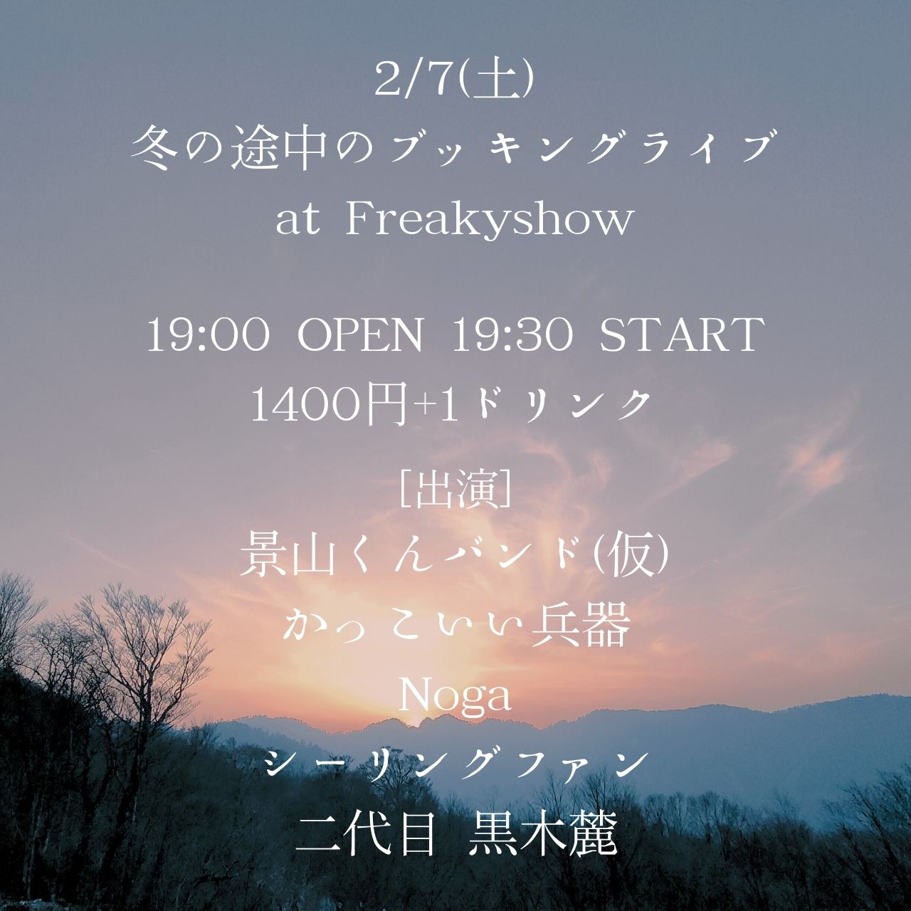 | 2026年2月7日(土) 冬の途中のブッキングライブ [出演]景山くんバンド(仮)/かっこいい兵器/Noga/シーリングファン/二代目 黒木麓 | ||