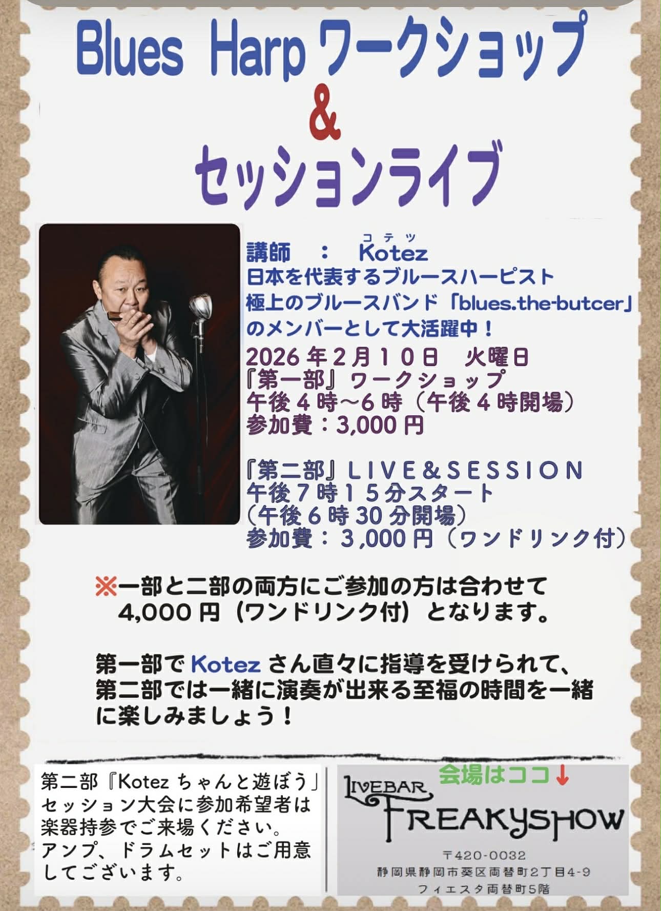 | 2026年2月10日(火) Blues Harp ワークショップ&セッションライブ 講師 Kotez(コテツ) | ||